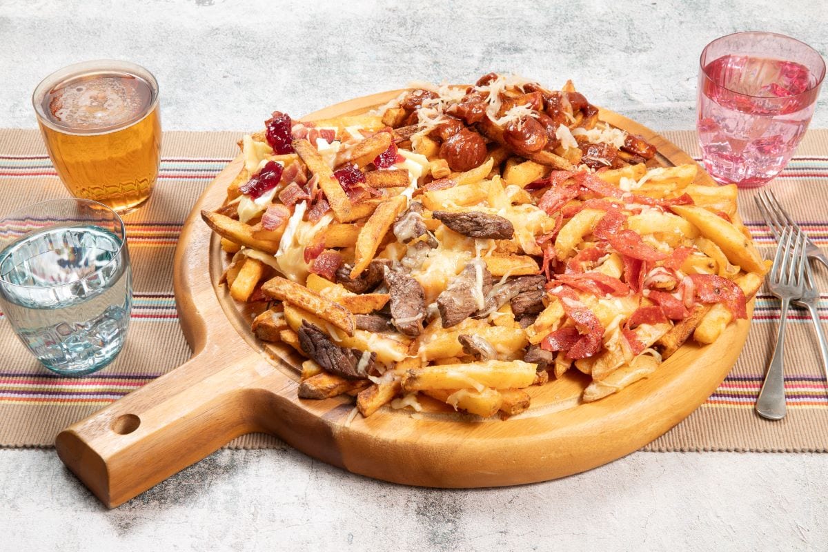 To assemble place fries onto an ovenproof board and layer up 1/4 with the curry bratwurst and sauerkraut 1/4 with brie and cranberry 1/4 with steak and cheese and the final 1/4 with cheese and pepperoni. Place in preheated oven for 5 minutes until the cheese has melted.