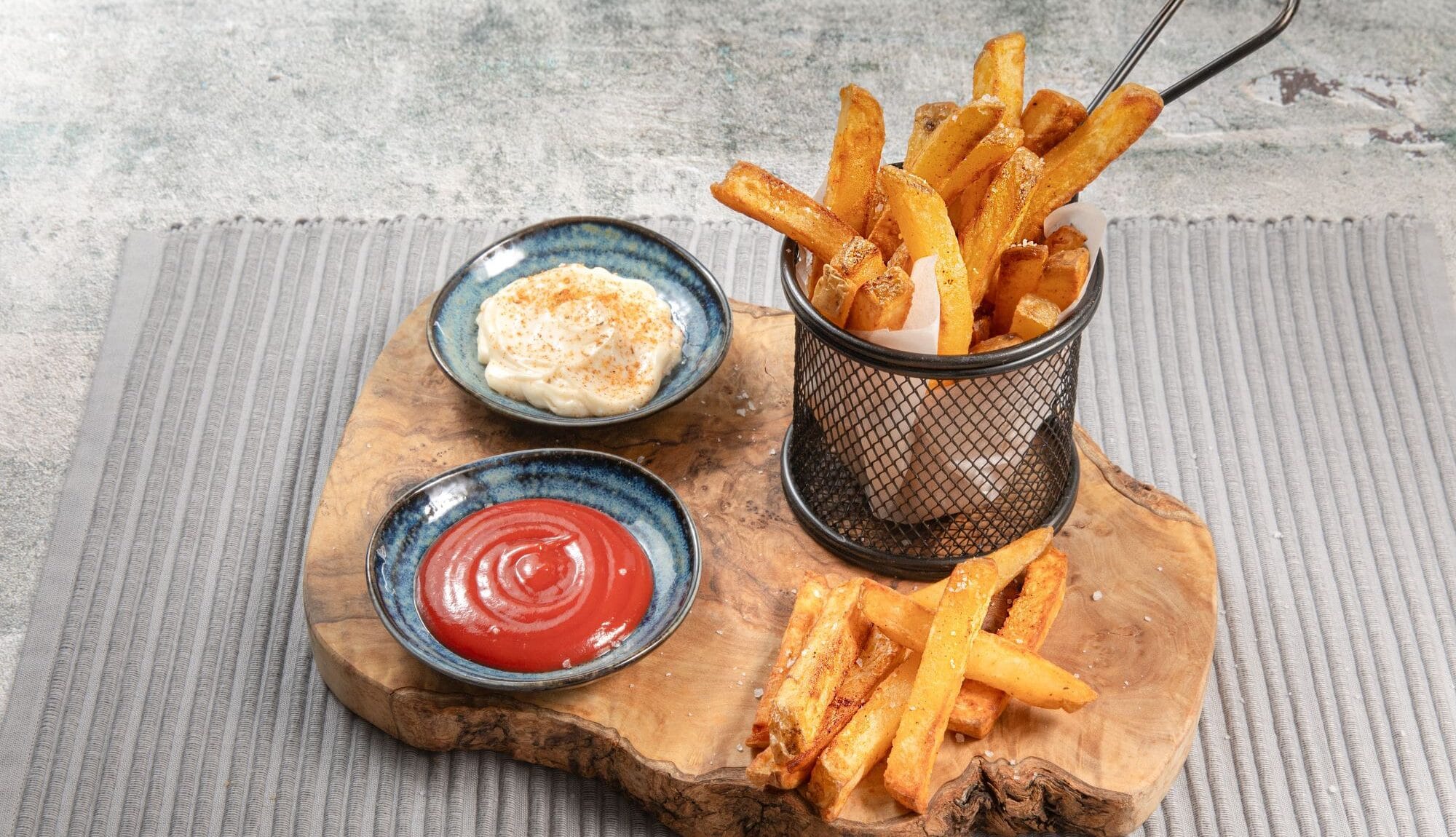 Wash the potatoes (no need to peel) and cut into chips around 1cm thick. Sprinkle with cornflour and paprika and mix until the chips are evenly coated, then toss in the oil and season with salt & pepper.