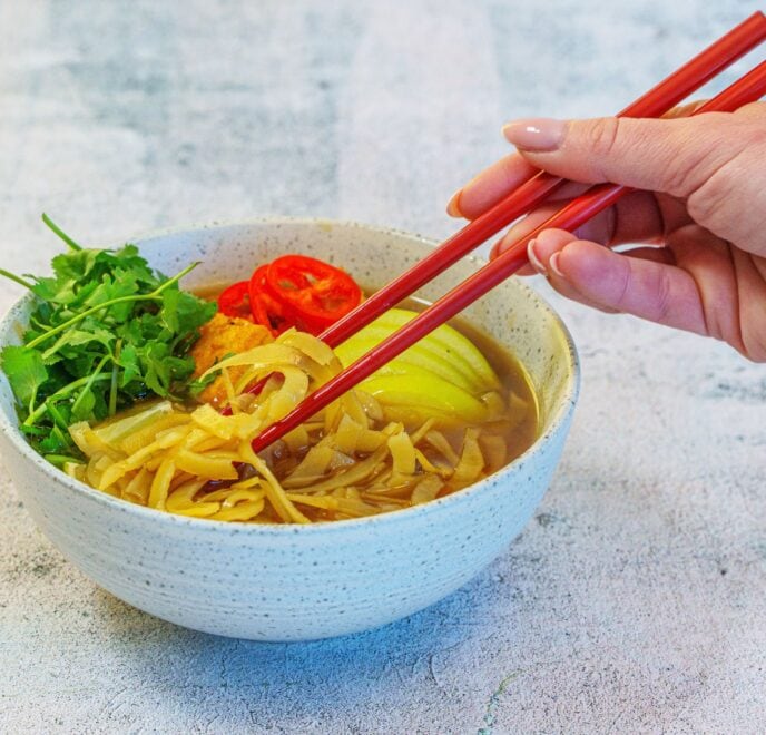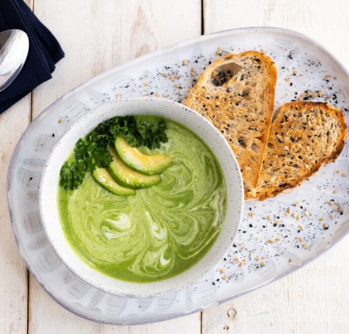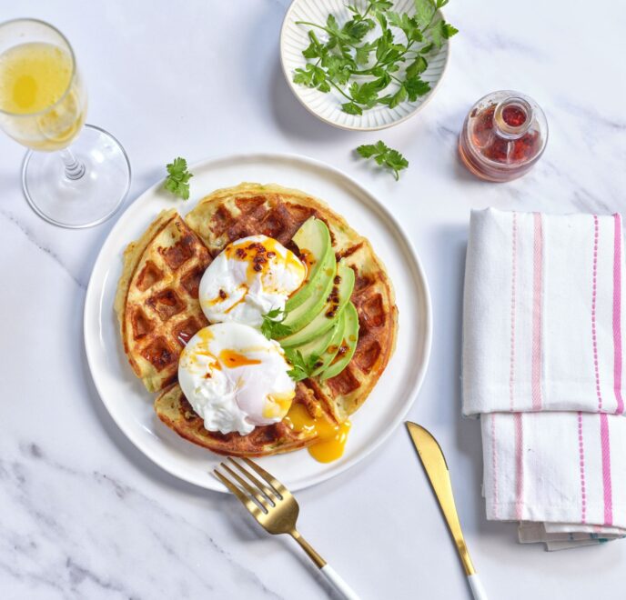 Meanwhile bring water to the boil in a large saucepan. Whisk the simmering water and crack the eggs into the moving water, poaching them for 2 – 3 minutes.