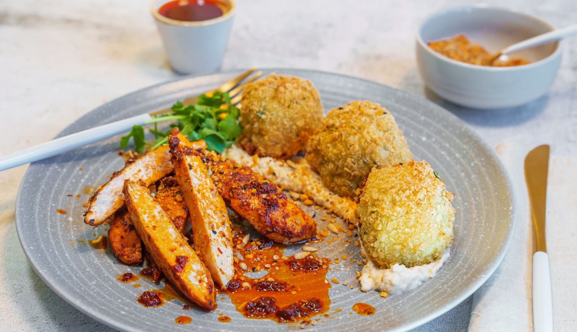 Spoon a generous tablespoon of hummus onto each plate, top with 3 potato bombs. Cut the chicken into 3-4 slices and place next to the bombs. Mix harissa paste with the olive oil and drizzle over. Finish with a good sprinkle of dukkha mix.